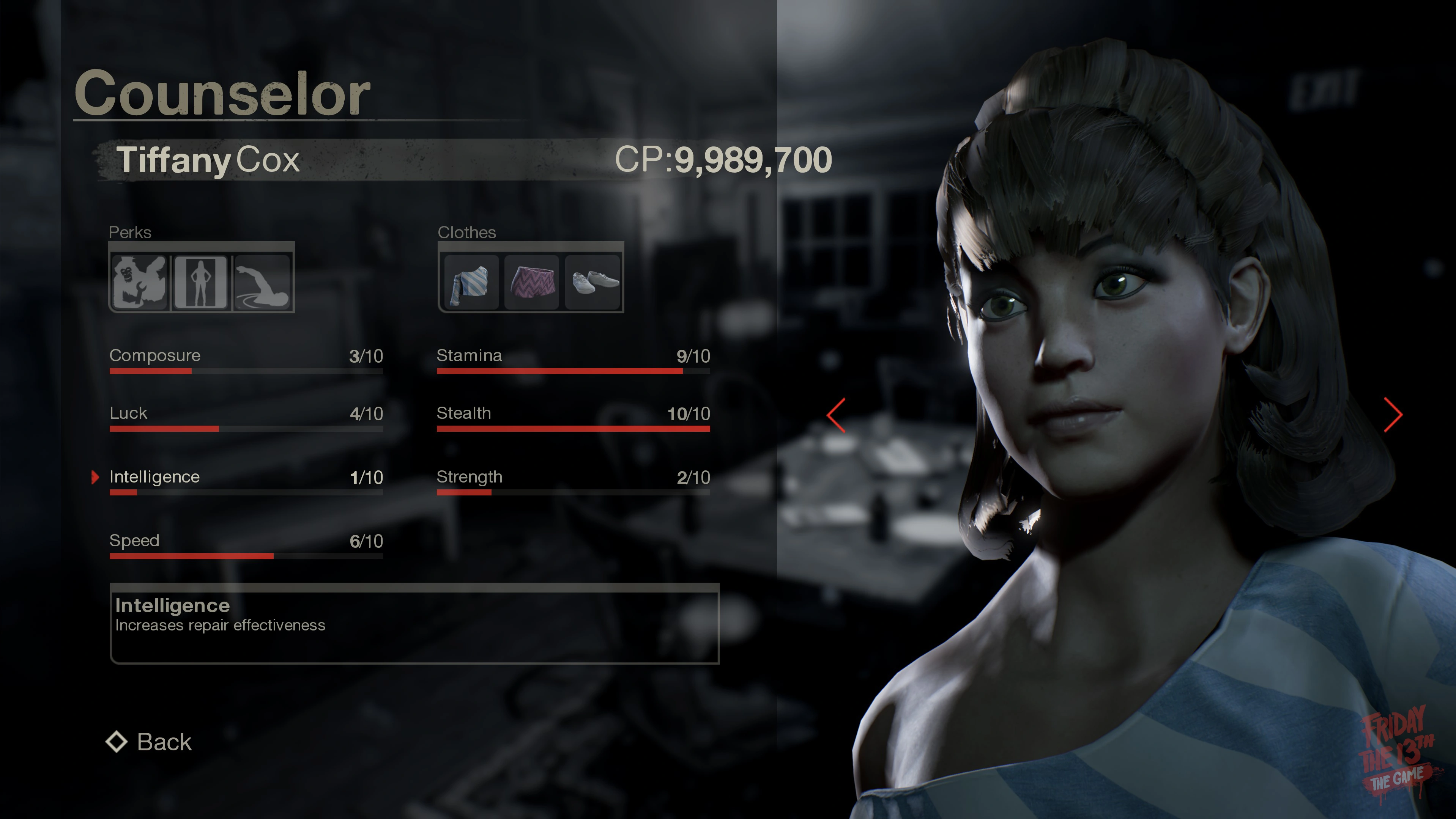 Thanks to her athleticism, Tiffany is an ideal female counselor to wear Pamela's sweater; she can bolt away while standing a decent chance of staying away from Jason. And if done early in the match, Jason might not be able to Sense her if he cannot Morph immediately to the Shack since Tiffany might've gained a considerable amount of distance away. With maxed stealth, it becomes difficult for Jason to locate her, and this puts even more pressure on Jason since he will be forced to wait until later stages in the game in order to potentially find her using Sense (so long as Tiffany stays away from major objectives as well as counselors who make a lot of noise).